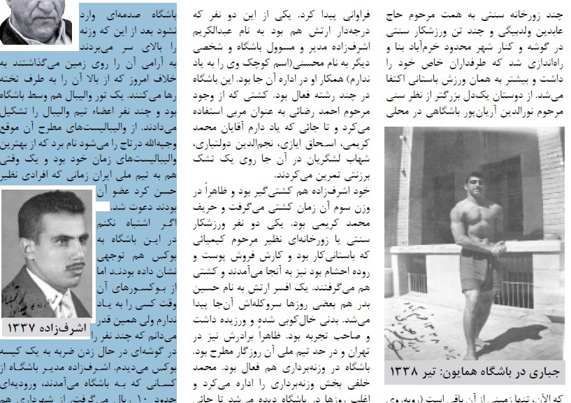 در همان منطقه، گروهي از بچههای محلهي پشتبازار شامل احمد پيوستگر و برادرش، لطفالله يگانه، صحبتالله اميدی و بيگلر كه از ما بزرگتر بودند نيز تمرين و بازی ميكردند. بچههای محله شمشيرآباد هم ضلع سوم بودند كه معمولاً در فصل تابستان به صورت رقابتي با هم مصاف ميداديم و كشتی ميگرفيتم.